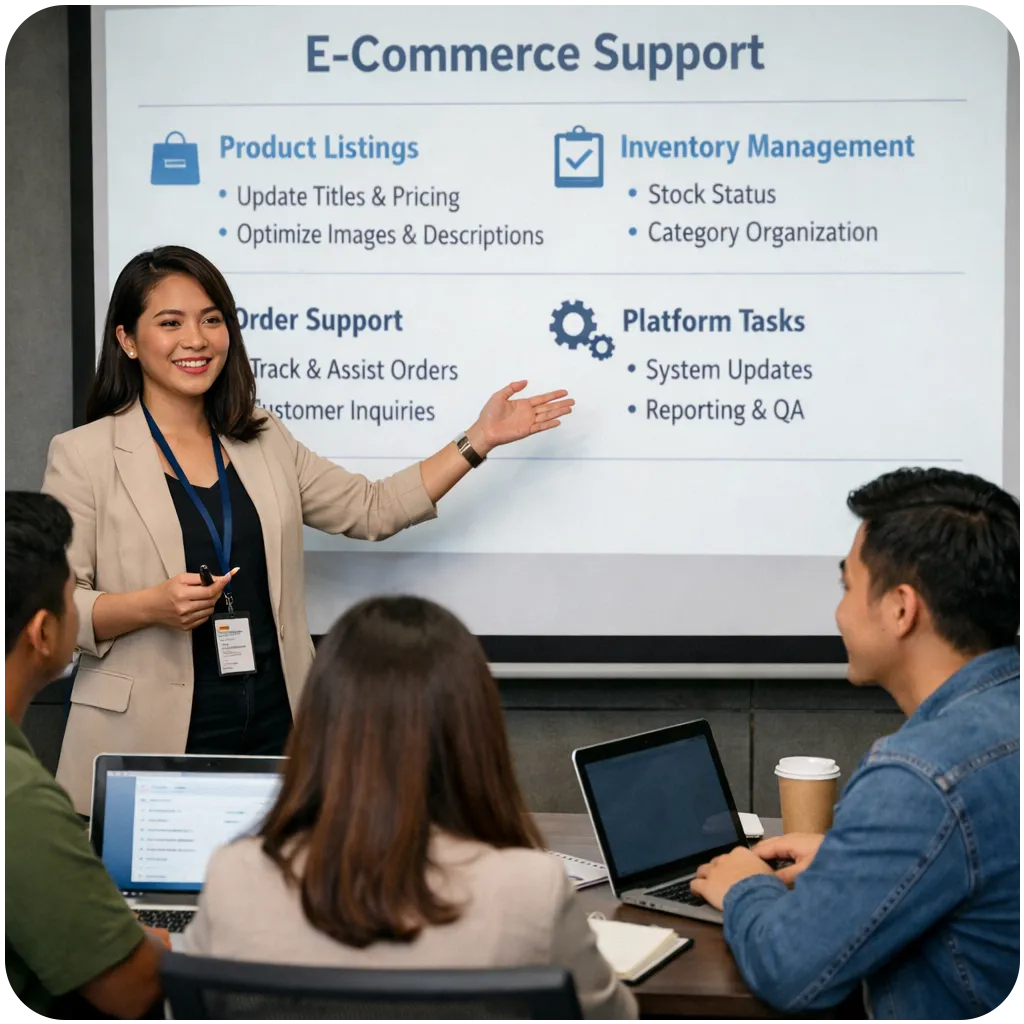 Get a strategically matched E-Commerce Virtual Assistant who keeps product listings clean, catalogs organized, orders supported, and platform tasks moving.
